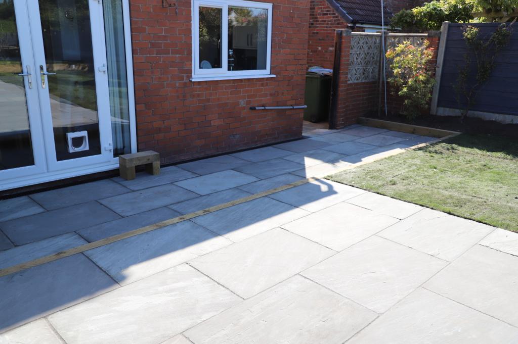 Indian Stone patio with premium turf and sleeper flowerbeds