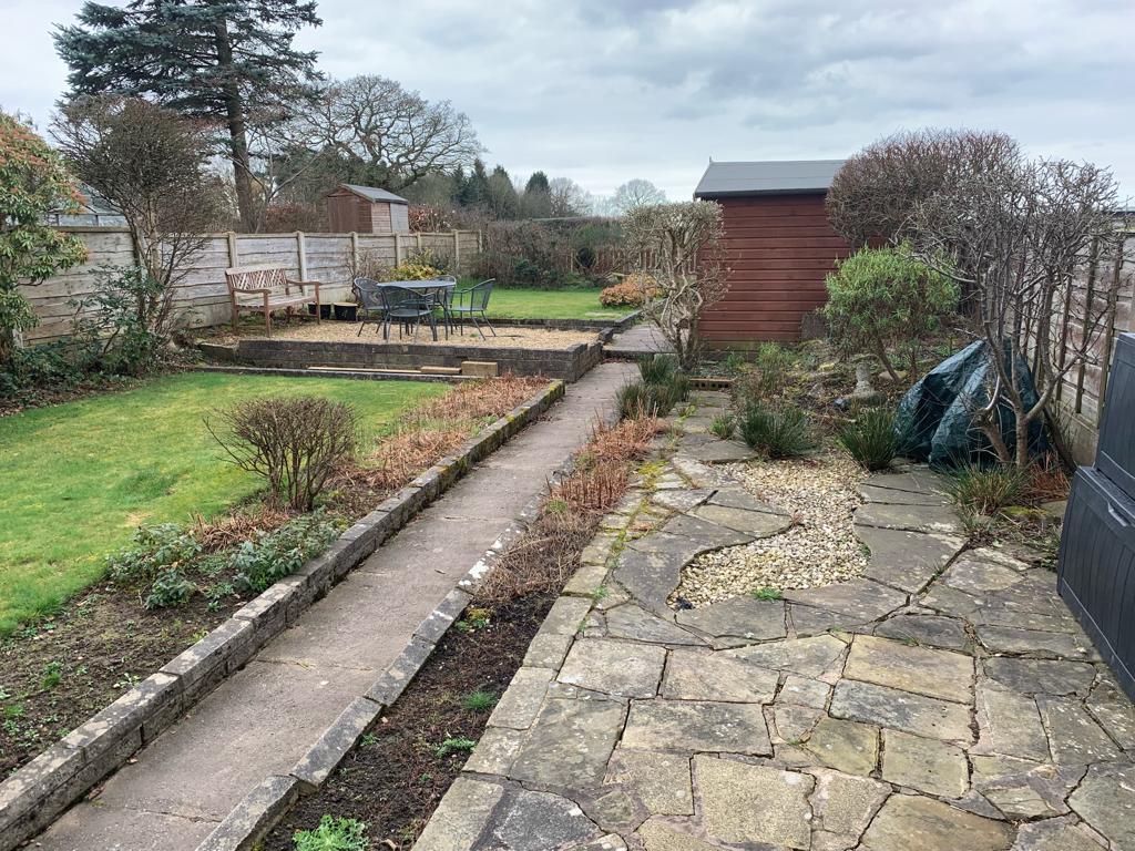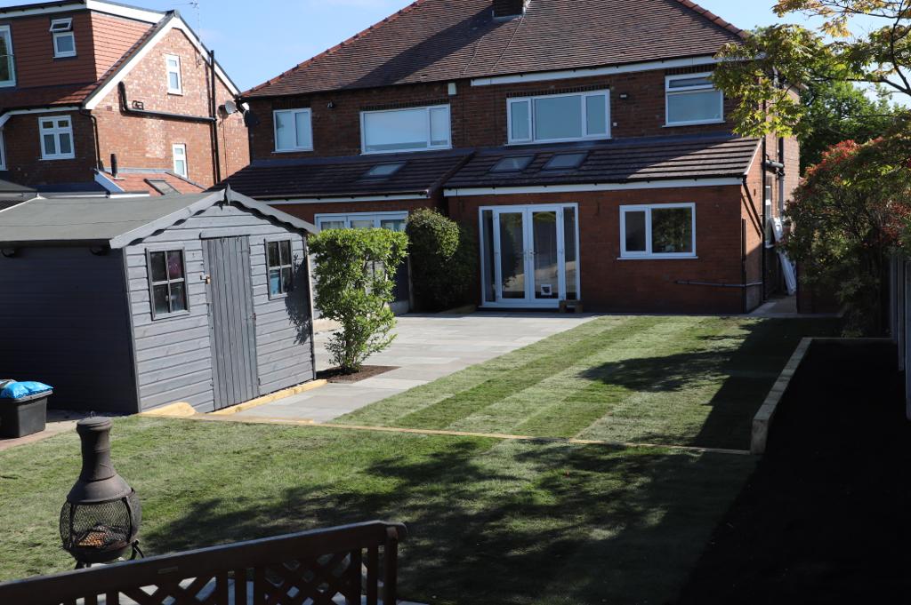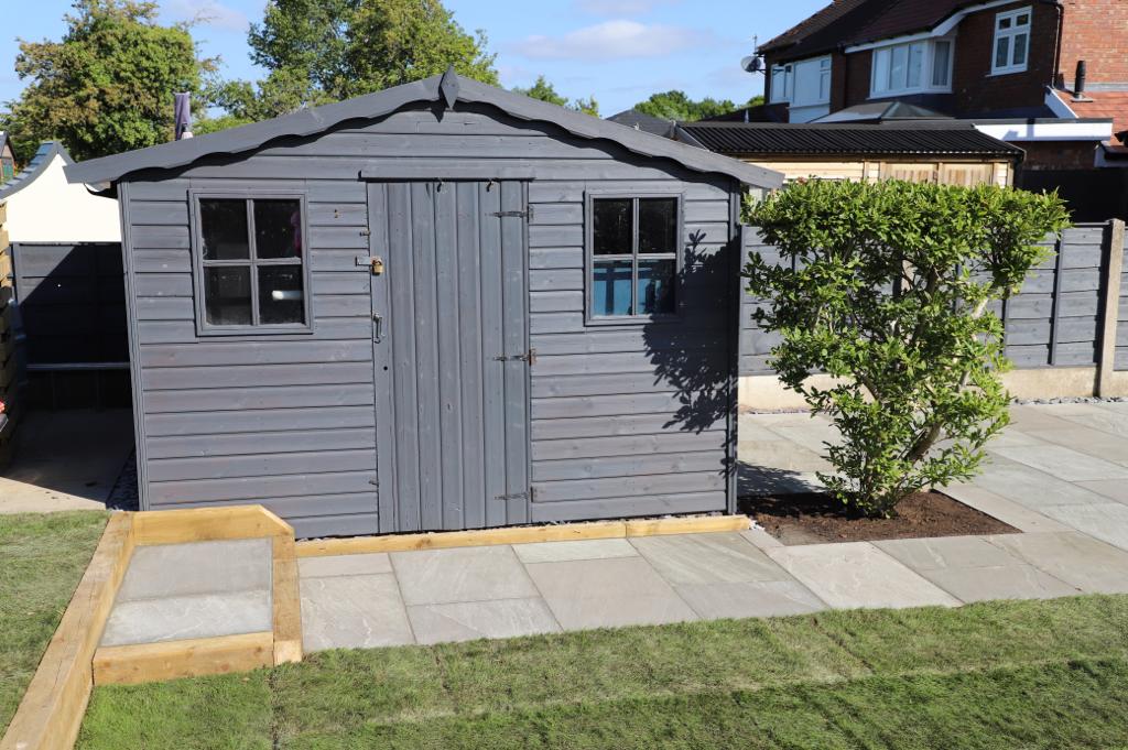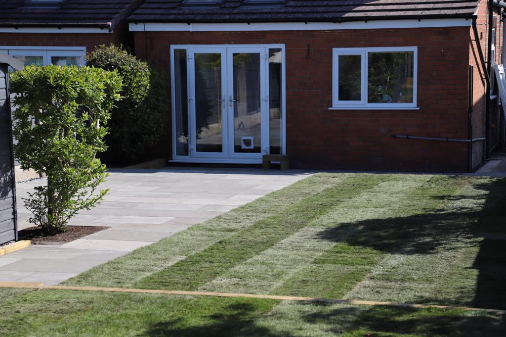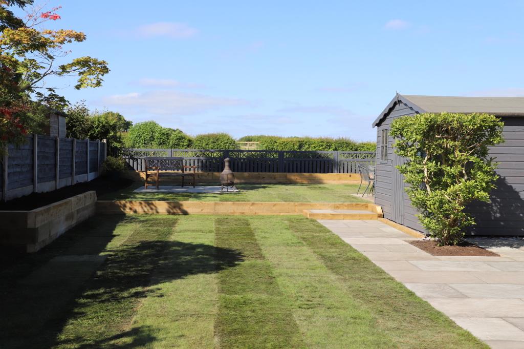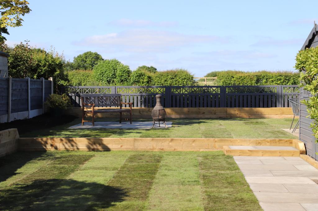 When we came the garden had a small standard patio area which wasn’t very big and grass that wasn’t looking so good. There were 4 levels that were quite small which made it not very practical. After a long discussion with the client we decided to put the garden onto three levels. The first level had a narrow Indian stone patio with sleeper steps up to the middle level. The next level had a large run of grass with a sleeper raised flower bed so the customer could get some vibrant colours in the garden with a mixture of shrubs and flowers. The final top section of the garden was separated with a beautiful sleeper boarder which lead up to the smaller patio area with turf surrounding.