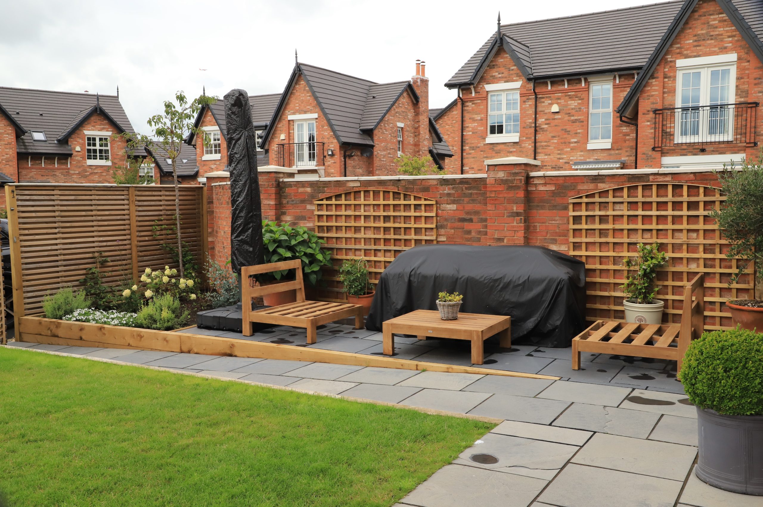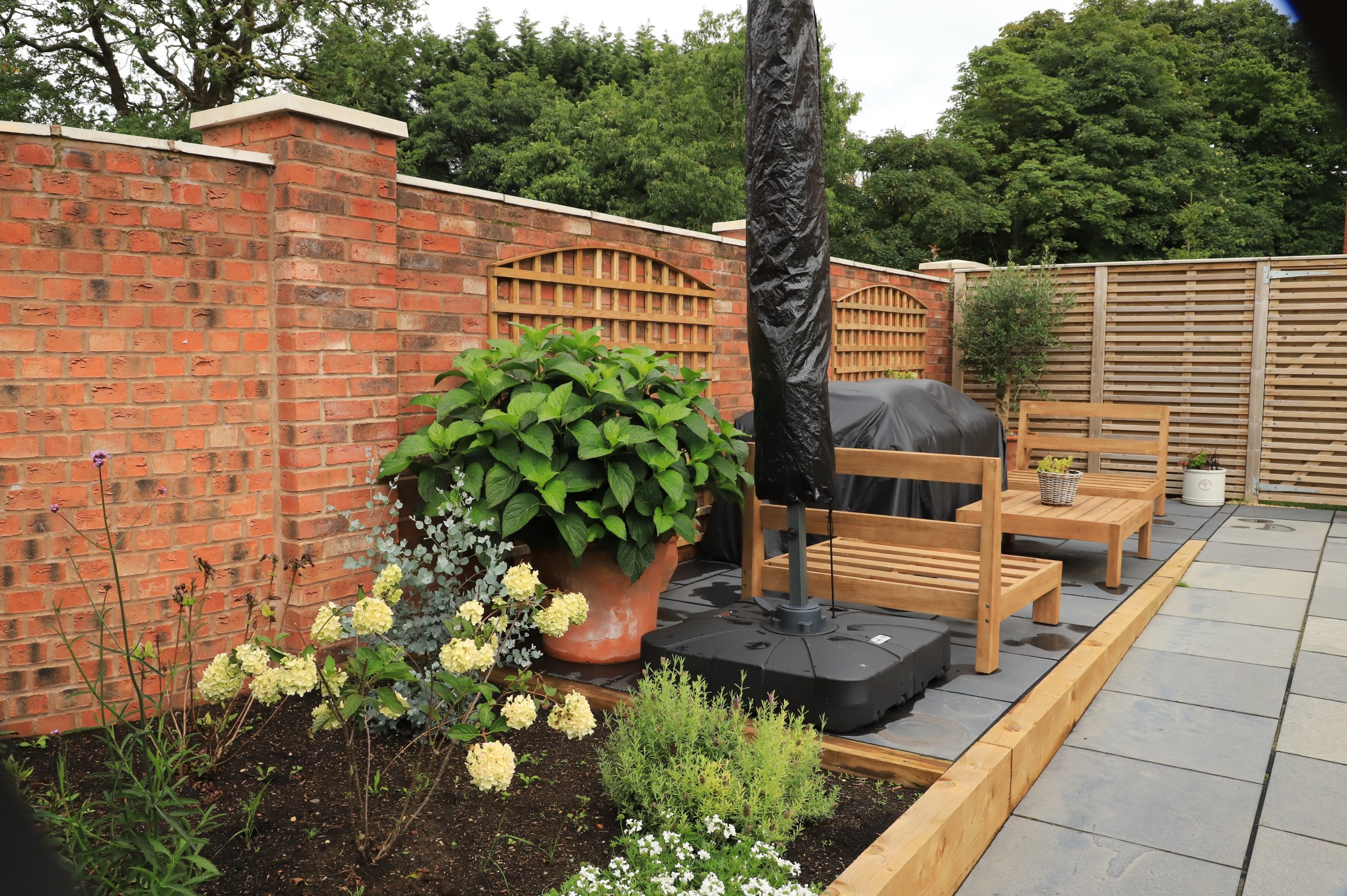 When we arrived on site the customer had a standard new build type garden with limited patio area to relax in, typically what you see in new build houses. The ground of the left hand side of the garden were lower than the rest which made it very impracticable space. The lawn was also on a slope making it harder for the children to play football. The lack of variety in plant selection and landscaping design made the space uninteresting and uninviting. The uneven grass posed challenges for maintenance and limited the potential for enjoyable outdoor activities.
