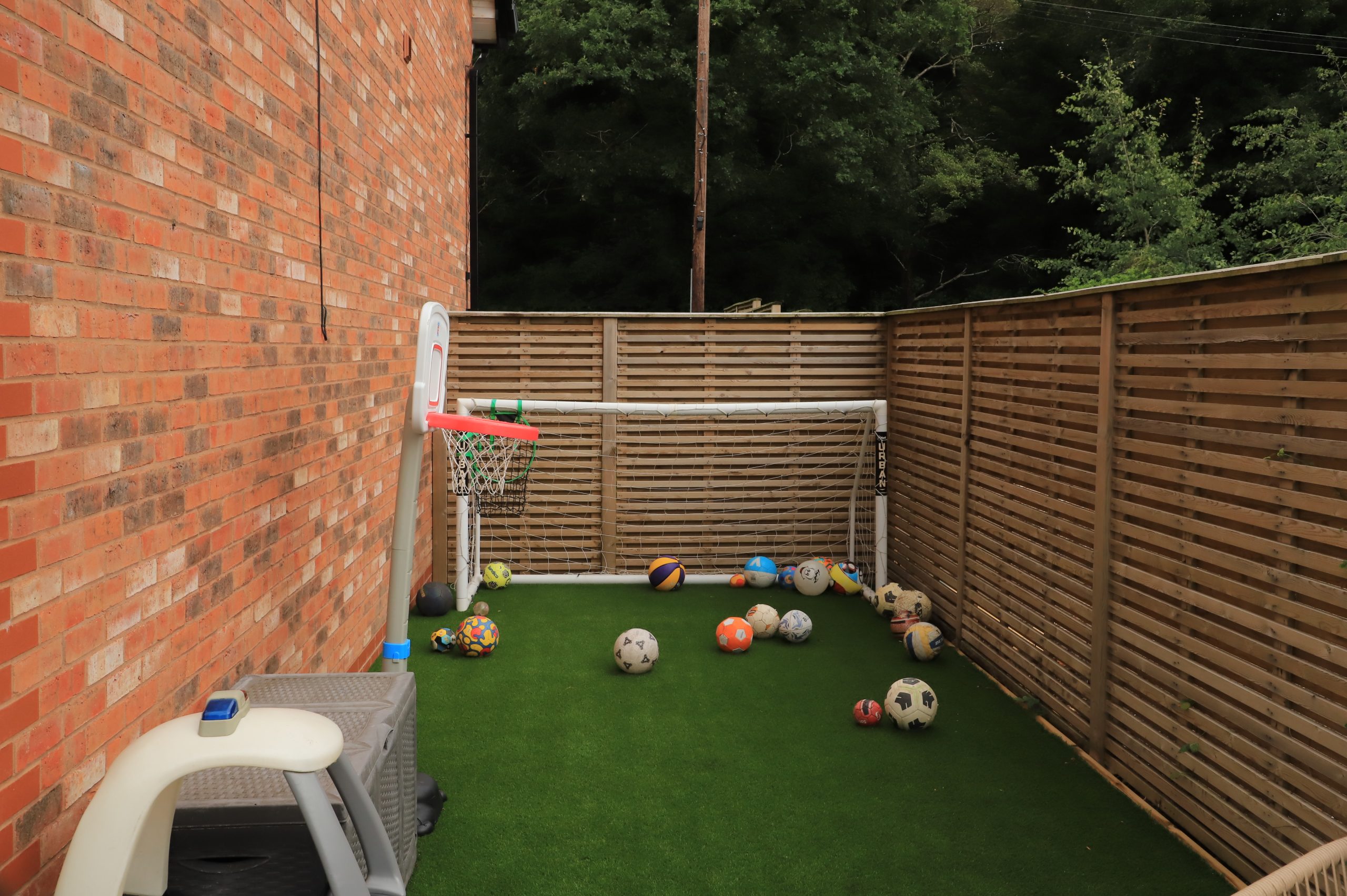 Around the side of the house was a forgot and unusable area. Our design team came up with and created the perfect space for the children to play in. We laid 32mm premium artificial grass sheet for the children to play football on. This meant that most of the main lawn wasn’t damaged by the clattering of children and their toys. Having a dedicated kids area in a garden is always recommended with larger spaces as its not always doable in smaller gardens.